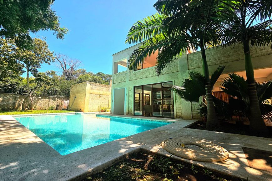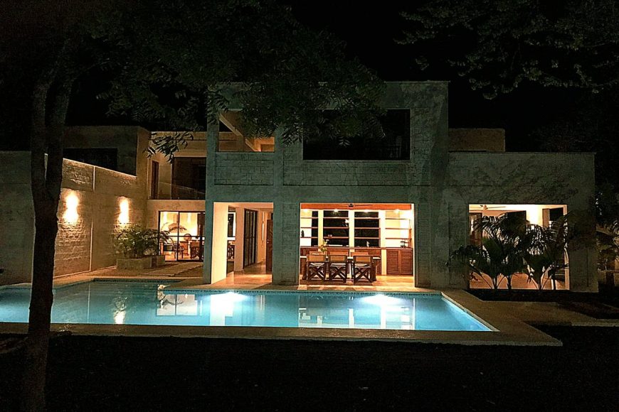 The large pool can be overseen from the large roofed terrace and indoor bar area. There is an additional tv room on groundfloor opening up to the green garden with old trees and palm trees. The large open kitchen is a highlight and the dining area facing the garden. There is plenty of separate storage room. Each bedroom has its own private terrace overlooking the garden.